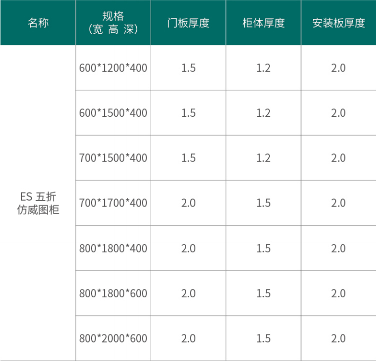 框架五折型材1.5mm,门板2.0mm,镀锌安装板2.5mm/2.0mm。
