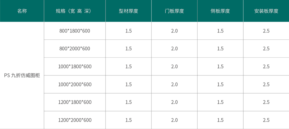 框架九折型材,门板2.0mm,背板、侧板1.5mm,安装板2.5mm。